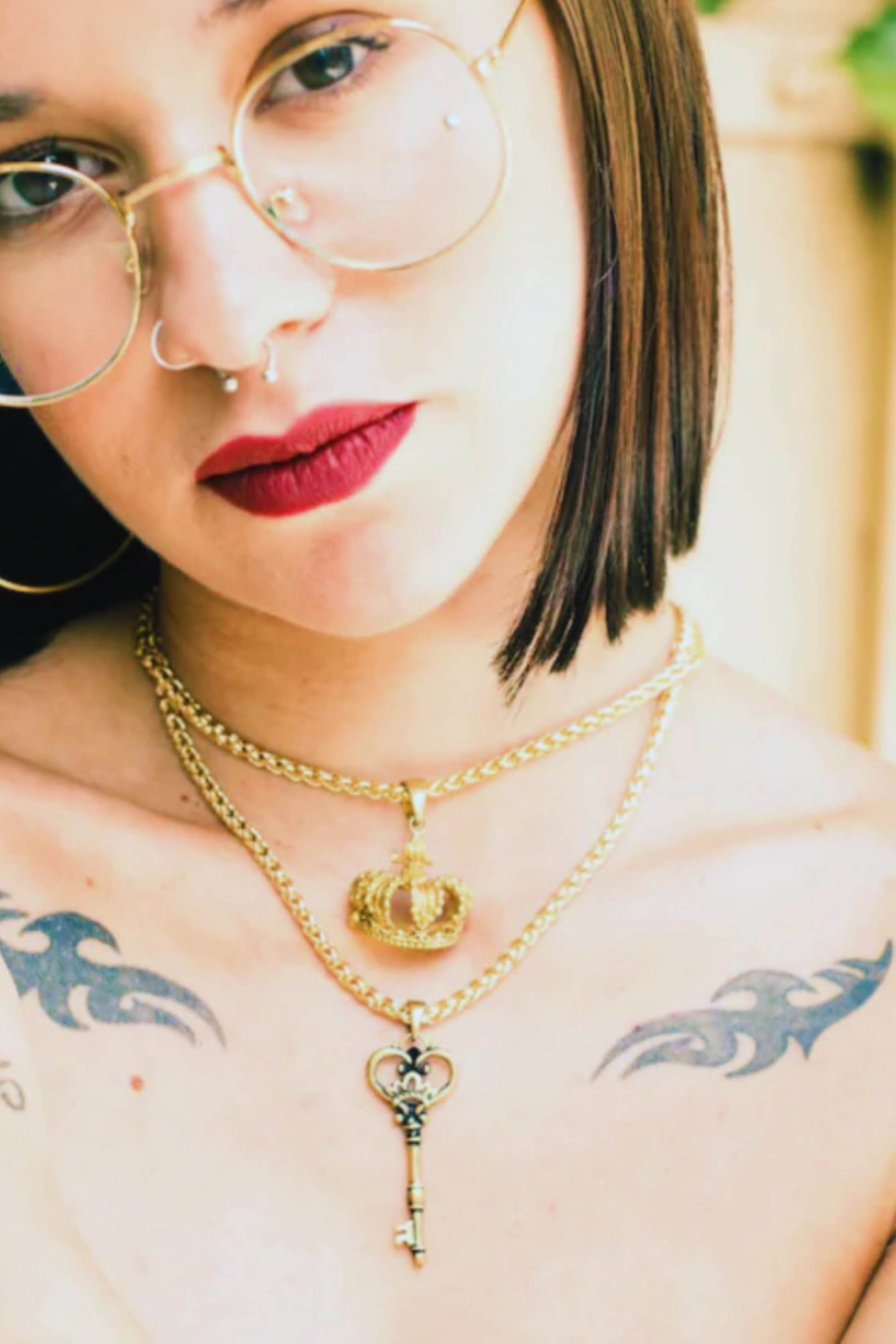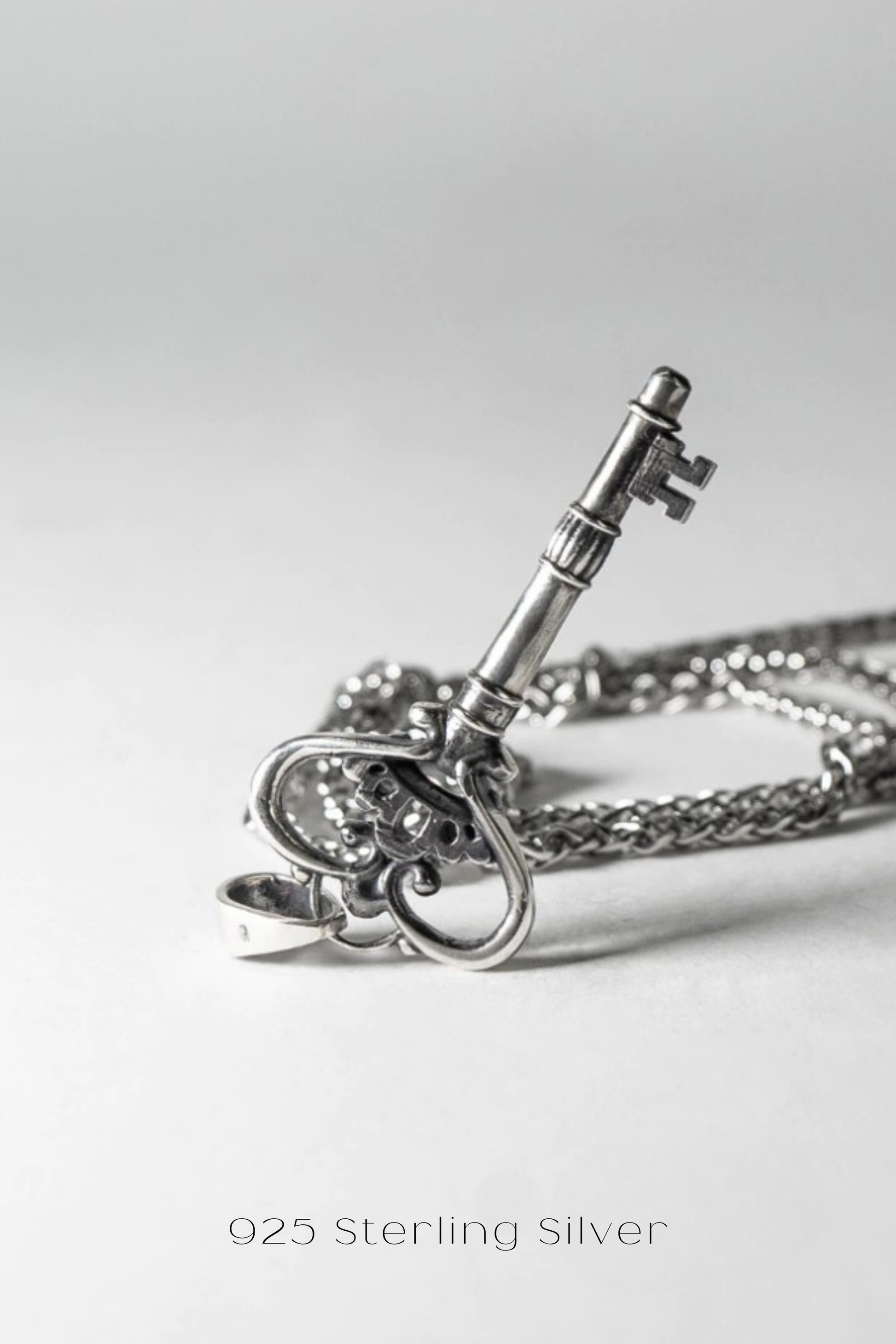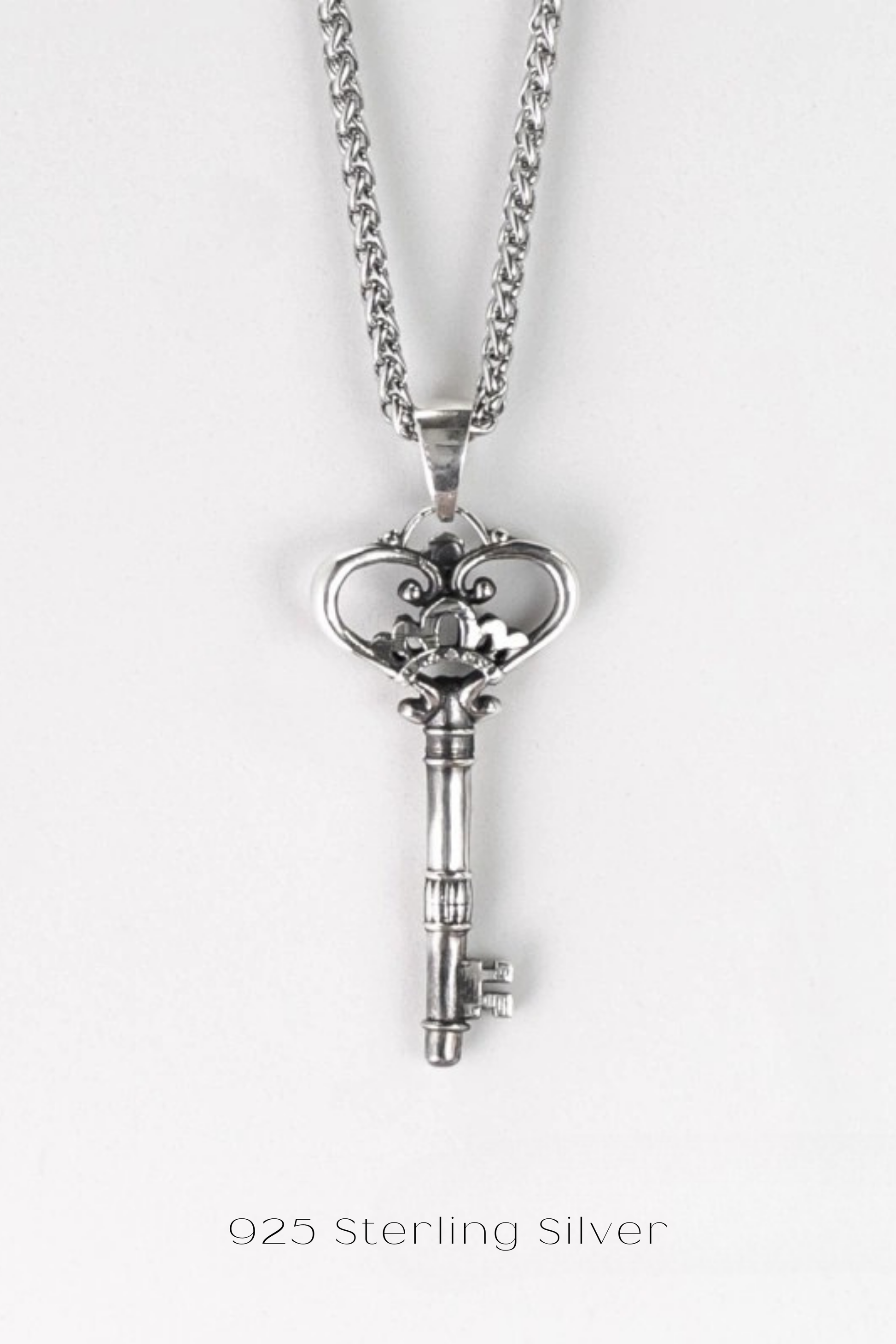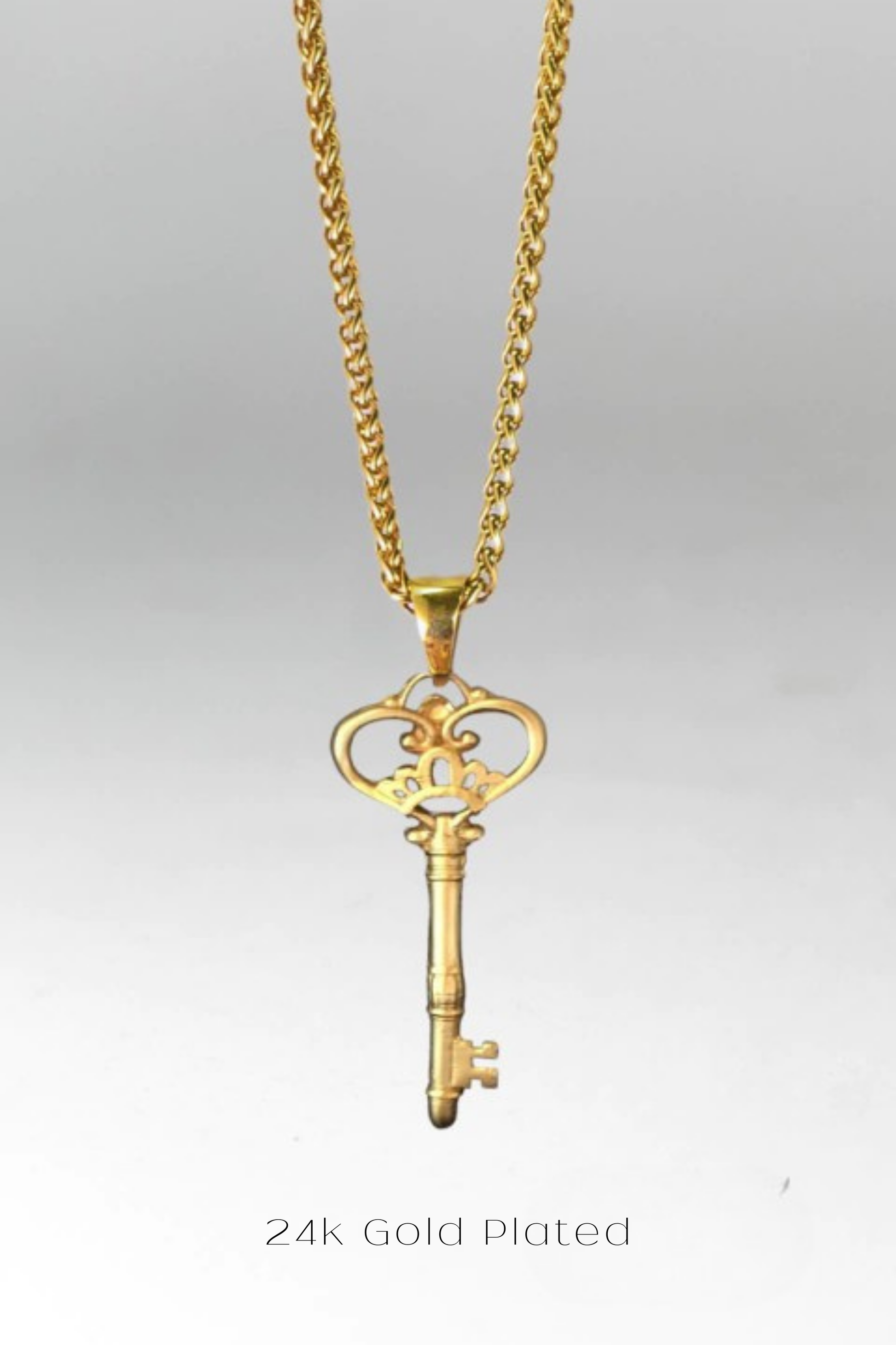The key pendant necklace, symbolizing opportunity and self-realization. Crafted with care, you can choose from different pendant materials. The accompanying chain is customizable in material and length. Carry this key as a reminder of your ability to unlock dreams. Ideal for personal wear or as a meaningful gift, it inspires on every occasion, perfect for those seeking their path and potential. Embrace the key's symbol and let it guide your spiritual journey, reminding you that answers and happiness are within reach