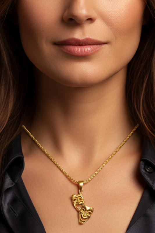 Collar de máscara de teatro: colgante dramático hecho a mano en bronce, plata de ley y baño de oro de 24 quilates.